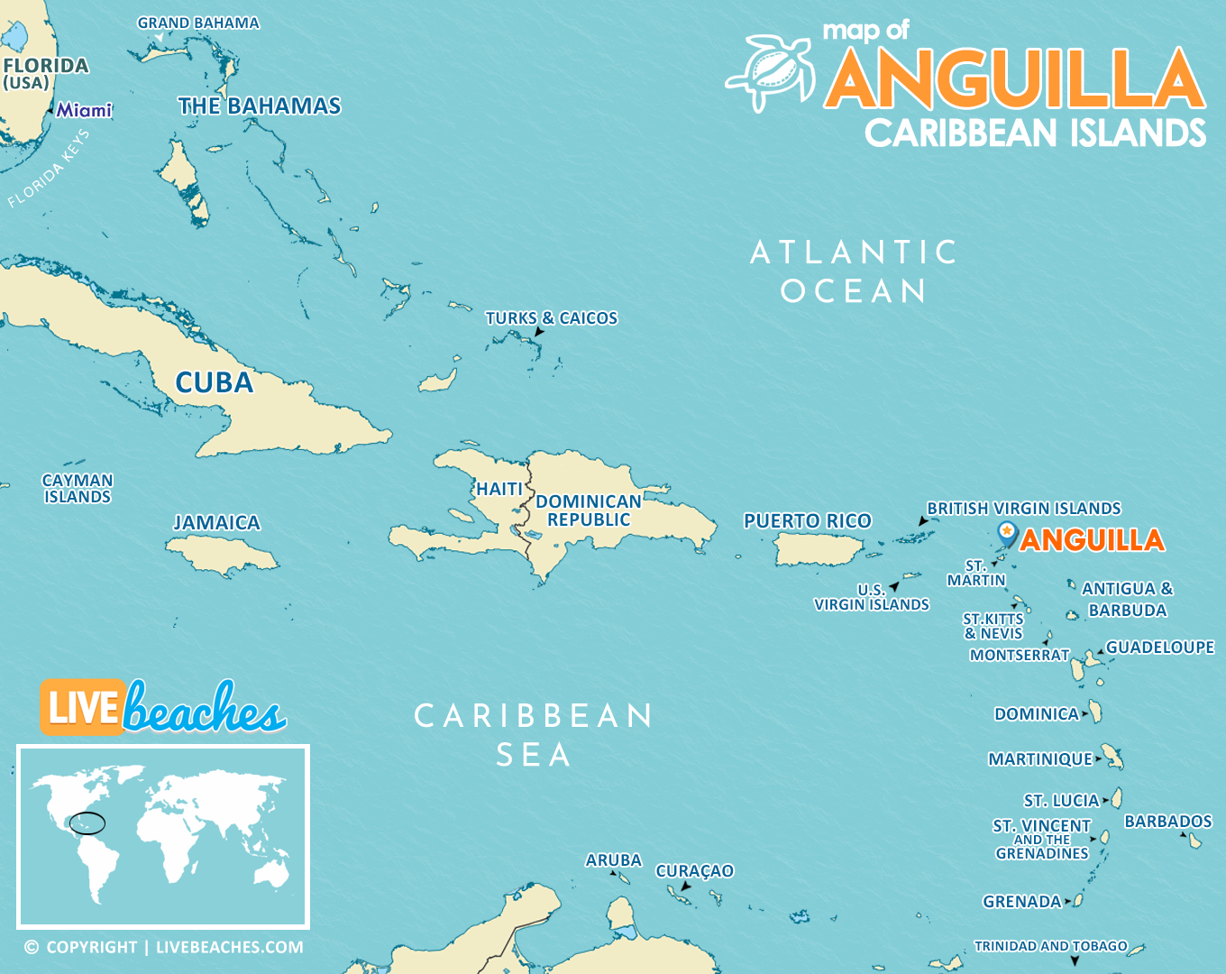 If you are planning to visit Anguilla in the Caribbean, use these maps as a guide to discover popular beaches, surrounding islands, and nearby cities. This printable travel map of Anguilla is a helpful guide for first time visitors to get to know the Caribbean Islands.