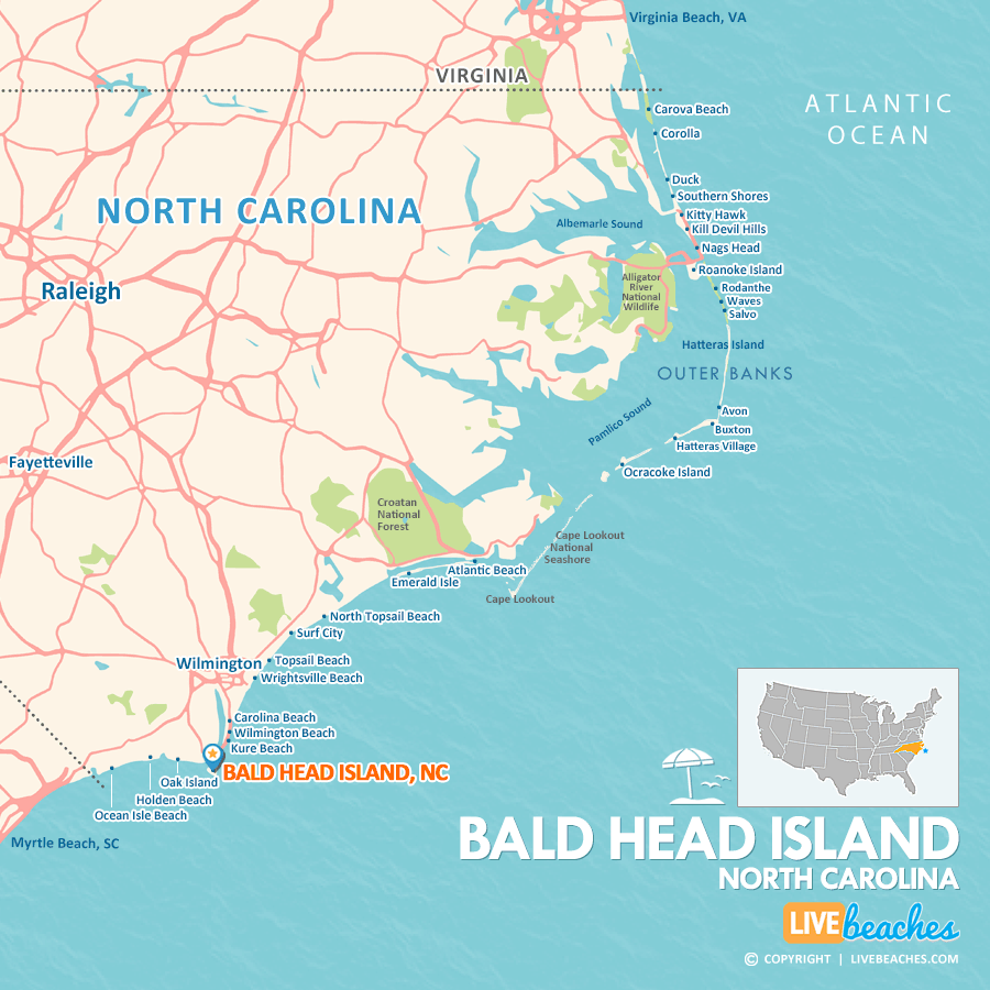 Map of Bald Head Island, NC, Nearby Beaches | Large Printable - LiveBeaches.com