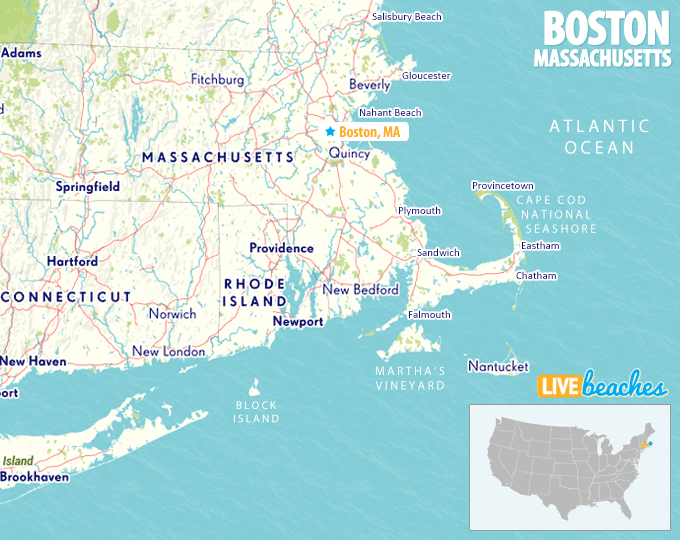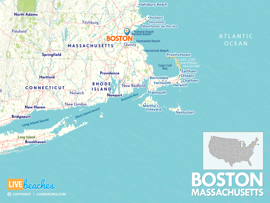 This map of Boston, Massachusetts is a helpful guide for first time visitors to get to know Cape Cod and the New England coastline. Use this map of Boston as a resource to discover nearby beaches, coastal towns, and popular places to visit.