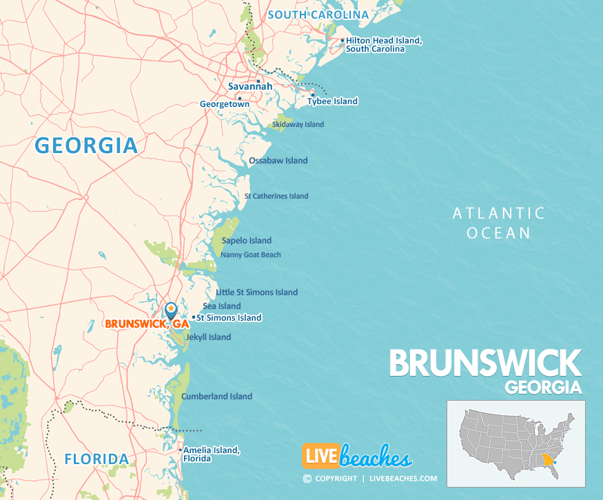 Map of Brunswick and coastal towns in Georgia. Use these maps as a guide to discover the best beaches and nearby points of interest. This printable travel map of Brunswick, GA is a helpful guide for first time visitors to get to know the beaches of Georgia.