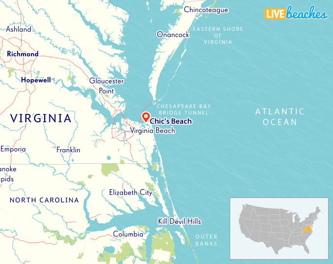 Map of Chic’s Beach and coastal towns in Virginia. Use these maps as a guide to discover the area and nearby points of interest. This printable travel map of Chic’s Beach, VA is a helpful guide for first time visitors to get to know the beaches in Virginia.