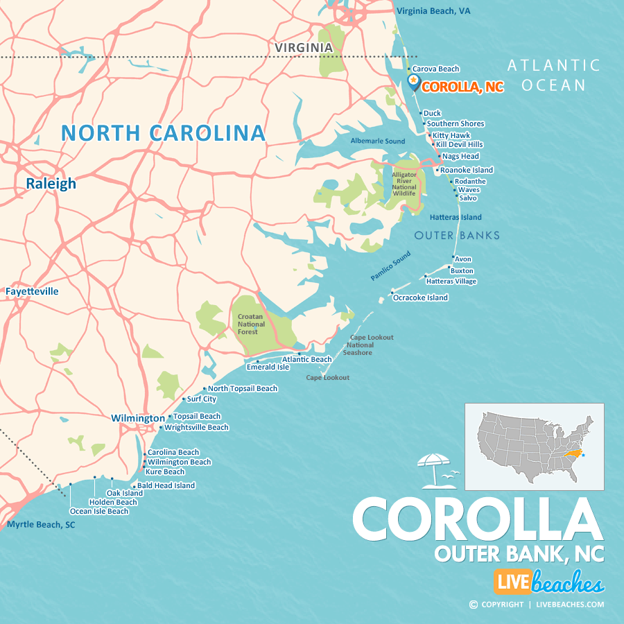 Map of Corolla and coastal towns in North Carolina. Use these maps as a guide to discover the best beaches and nearby points of interest. This printable travel map of Corolla, NC is a helpful guide for first time visitors to get to know the beaches of North Carolina.