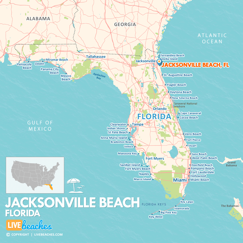 Map of Jacksonville Beach and popular nearby beaches in Florida. Use these regional maps as a guide to learn the area and points of interest along the Florida Coast.