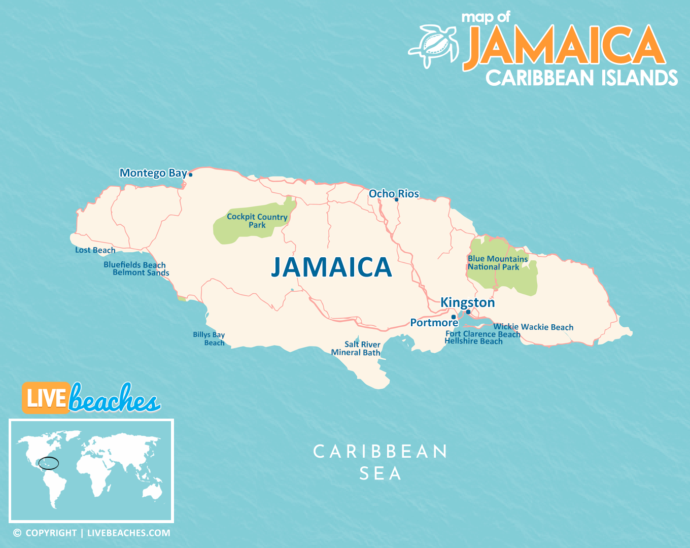 This map of Jamaica in the Caribbean is a helpful guide for first time visitors to get to know the island and resort areas. Use this map of Jamaica as a resource to discover nearby beaches, surrounding islands, and popular places to visit.