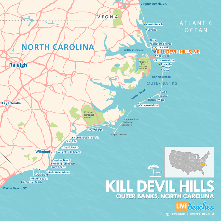 Map of Kill Devil Hills and coastal towns in North Carolina. Use these maps as a guide to discover the best beaches and nearby points of interest. This printable travel map of Kill Devil Hills, NC is a helpful guide for first time visitors to get to know the beaches of North Carolina.