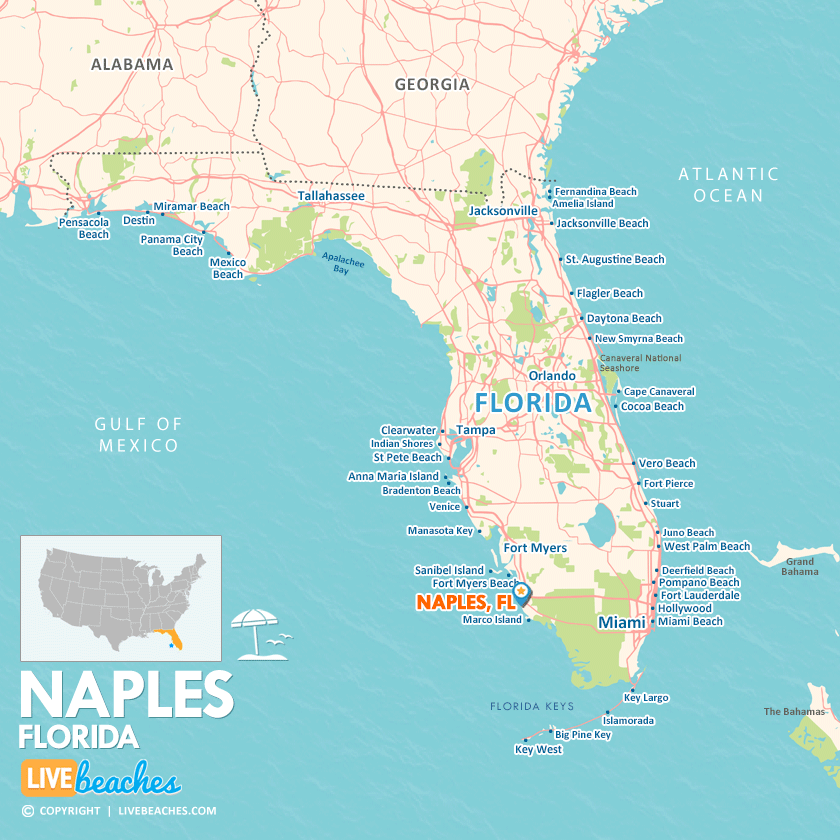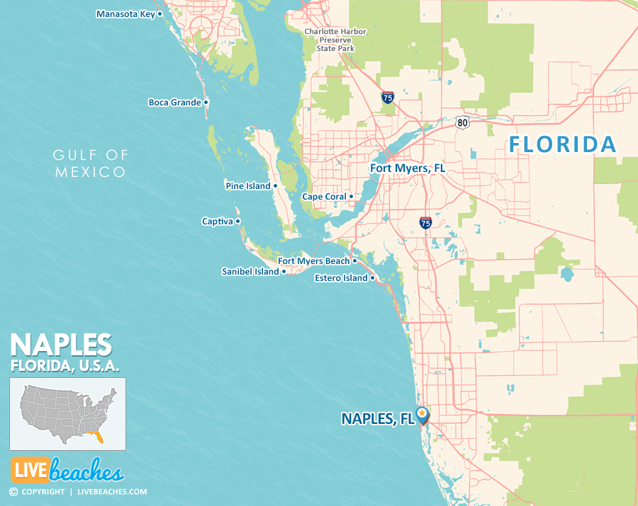 Map of Naples and popular nearby beaches in Florida. Use these regional maps as a guide to learn the area and points of interest along the Florida Coast.