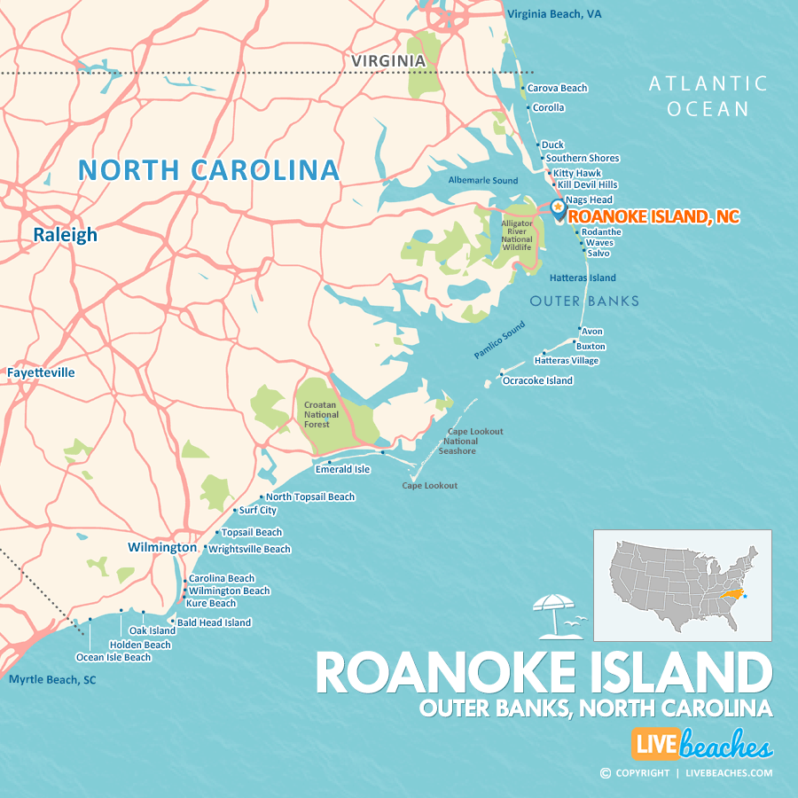 Map of Roanoke Island, NC, OBX, Nearby Beaches | Large Printable - LiveBeaches.com