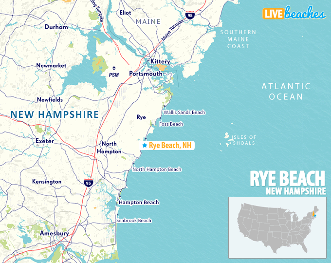Map of Rye Beach and popular nearby beaches & coastal towns in New Hampshire.