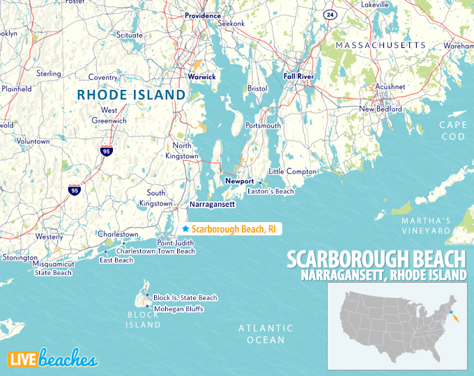 Map of Scarborough Beach in Narragansett and popular nearby beaches & coastal towns in Rhode Island.