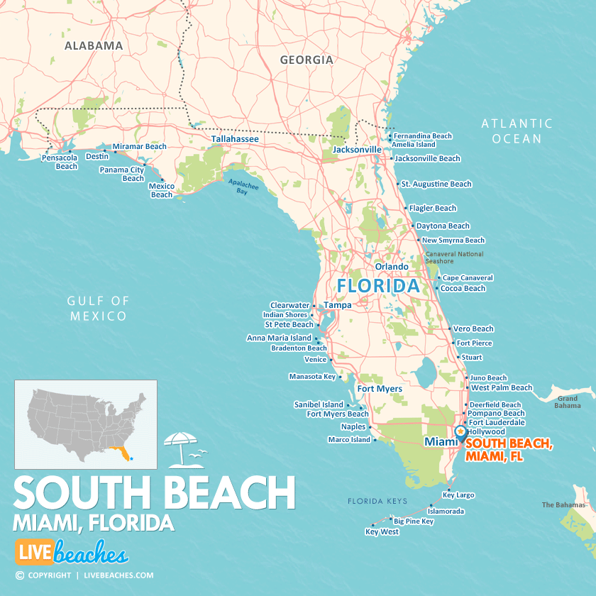Map of South Beach, Miami and popular nearby beaches in Florida. Use these regional maps as a guide to learn the area and points of interest along the Florida Coast.