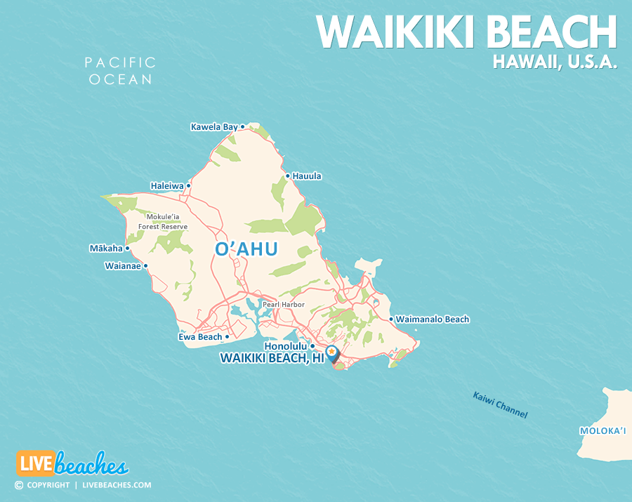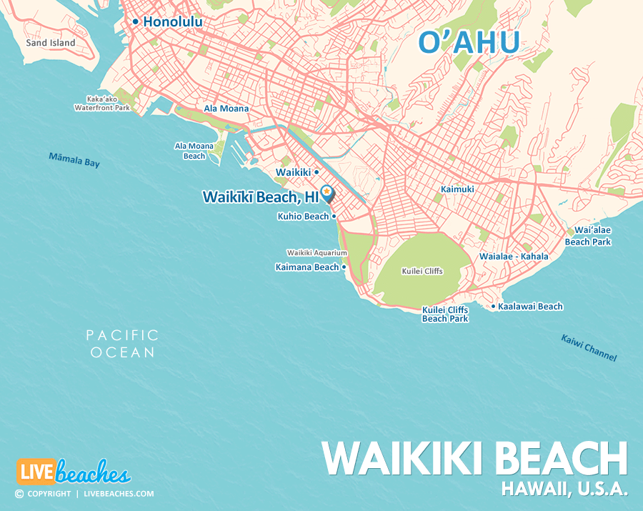 This map of Waikiki Beach, Hawaii is a helpful guide for first time visitors to get to know the Hawaiian Islands. Use this map of Waikiki Beach, HI as a resource to discover the best beaches, popular points of interest, and the nicest islands to visit.