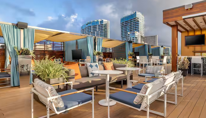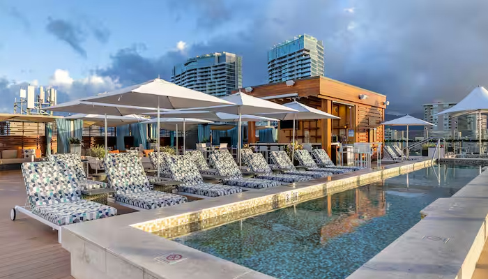 Hyatt Place Waikiki Beach features 426 generously sized rooms, offering stunning views of the ocean, city, or mountains. To enhance your stay, the hotel provides a range of amenities, including a cozy 24/7 café/bar, a fitness center for those who wish to stay active, an inviting outdoor pool, and versatile meeting facilities for any gatherings you might have.