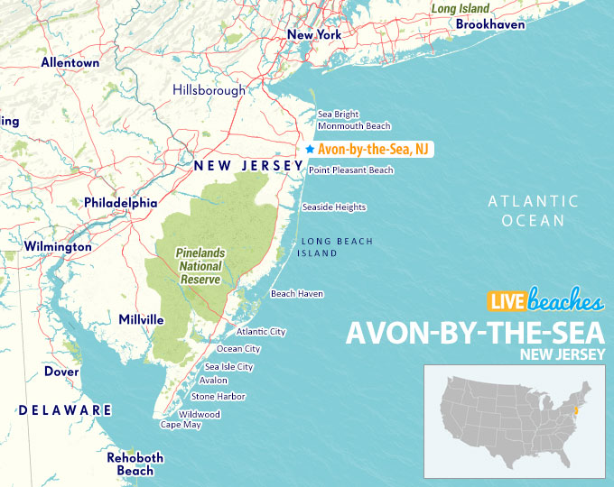This area map of Avon-By-The-Sea includes nearby beaches and points of interest. View live webcams from Avon-By-The-Sea, NJ and check the current weather, surf conditions, and scenic views from the beaches in New Jersey.
