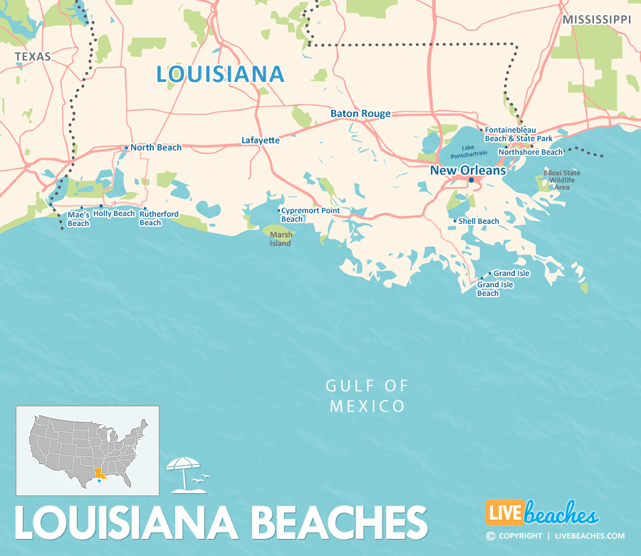 This map highlights popular beaches & coastal towns in Louisiana. Use this page as guide to discover the best beaches to visit in Alabama. View live beach webcams in Louisiana and check the current weather and beach activity from your favorite Louisiana beaches.
