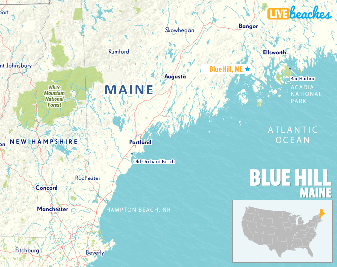 This area map of Blue Hill, Maine includes nearby beaches and points of interest.