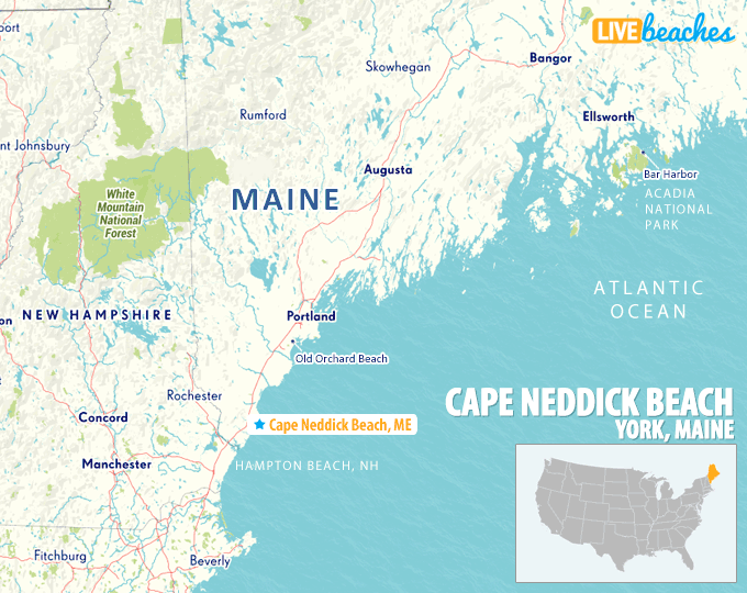 This area map of Cape Neddick Beach, Maine includes nearby beaches and points of interest.