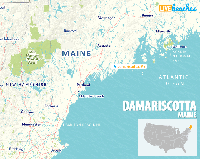 This area map of Damariscotta, Maine includes nearby beaches and points of interest.