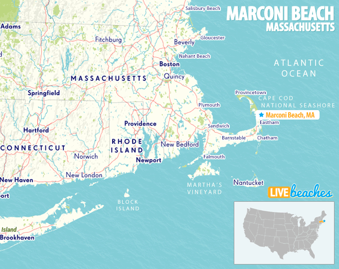 This area map of Marconi Beach, Massachusetts in Cape Cod National Seashore includes nearby beaches and points of interest.