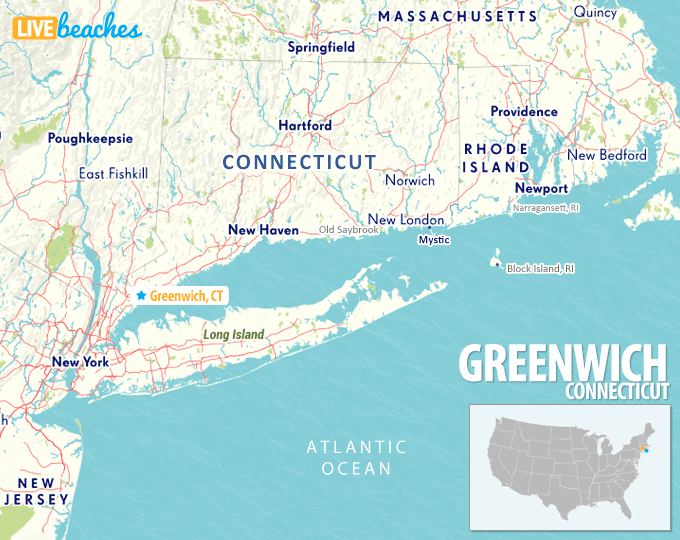 This area map of Greenwich, Connecticut includes nearby beaches and points of interest.