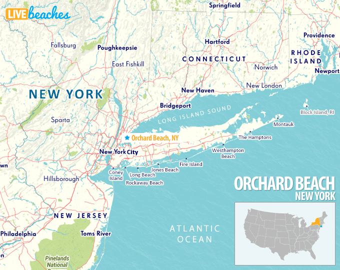 This area map of Orchard Beach, New York includes nearby beaches and points of interest.