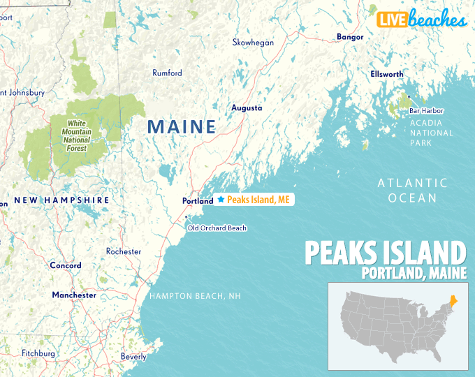 This area map of Peaks Island in Portland, Maine includes nearby beaches and points of interest.