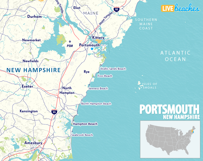 This area map of Portsmouth, New Hampshire includes nearby beaches and points of interest.