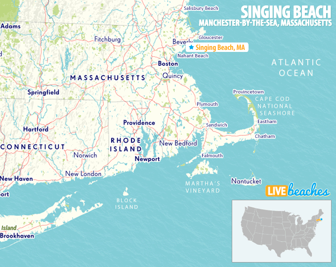 This area map of Singing Beach in Manchester-by-the-Sea, Massachusetts includes nearby beaches and points of interest.
