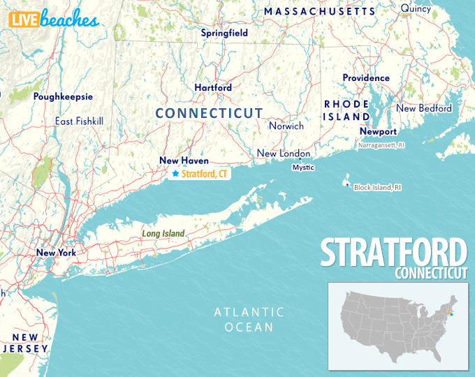 This area map of Stratford, Connecticut includes nearby beaches and points of interest.