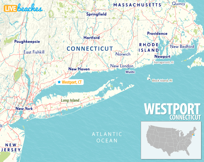 This area map of Westport, Connecticut includes nearby beaches and points of interest.