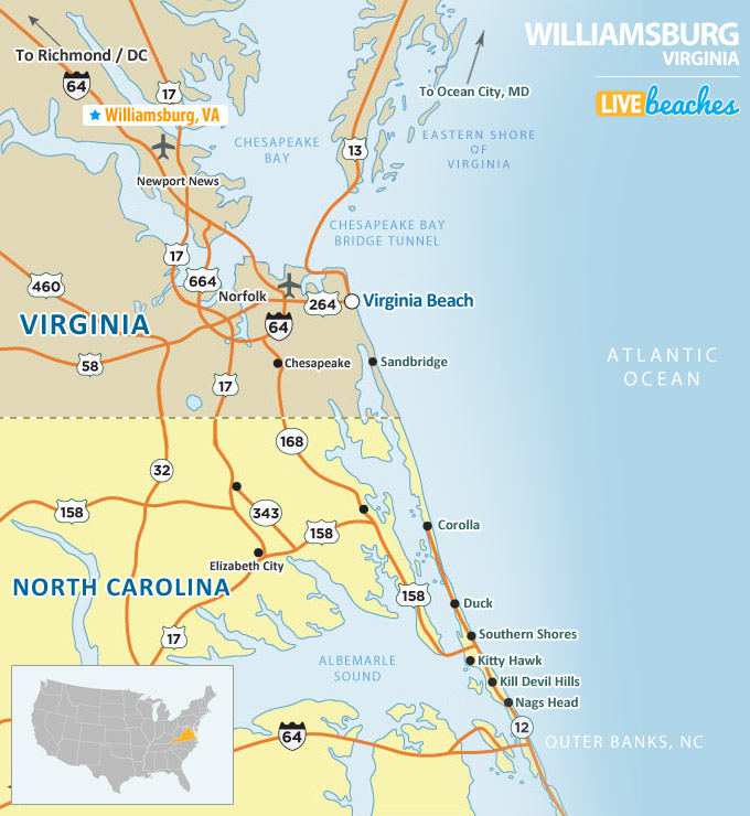 This area map of Williamsburg includes nearby beaches and points of interest. View live beach webcams in Virginia Beach, VA and check the current weather, surf conditions, and scenic views from the beaches in Virginia.