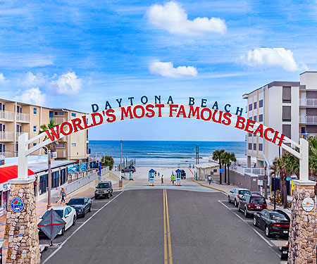 The Daytona Beach World’s Most Famous Beach sign is located 825 E International Speedway Blvd in Daytona Beach. An arched sign over a roadway leading the the “World’s Most Famous Beach” welcomes visitors to explore this popular beach in Florida.