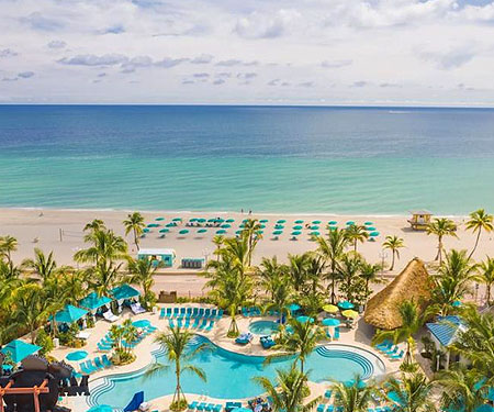 Guests enjoy amenities such as multiple pools, a full-service spa, on-site dining, and live entertainment. Just steps from the beach, the resort is also near attractions like the Hollywood Beach Theater and Anne Kolb Nature Center.